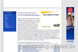 | Details: | Das DSL-Portal stellt alle relevanten DSL-Anbieter, die auf dem deutschen Breitbandmarkt operieren, vor. In einem Weblog wird laufend über neue Tarifmodelle der Internetprovider berichtet. Auch auf Sonderaktionen der DSL-Anbieter, bei denen insbesondere DSL-Einsteiger Geld sparen können, wird hingewiesen. Eine Top-10-Aufstellung zeigt stets die zehn aktuell preisgünstigsten DSL-Flatrate-Komplettpakete. Dabei ist der monatliche Gesamtpreis ersichtlich, und zwar inklusive des Preises für die DSL-Flatrate selbst sowie der monatlichen Grundgebühren für den Festnetzanschluss und für den Breitbandanschluss. |